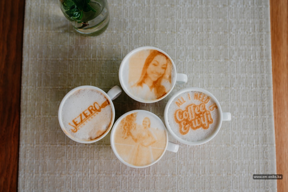 Prva novost koja nam stiže iz restorana “Jezero” vezena je za čarobni napitak bez kojeg se ne počinje idealan dan. Naime, restoran “Jezero” od nedavno je postao prvi restoran u BiH u kojem možete popiti kafu s ovakvim tipom personaliziranih poruka, omiljenih stihova ili citata, logotipom po želji ili čak fotografijom. Zahvaljujući aplikaciji Coffee Ripples te posebnim printer aparatom na pjeni vaše kafe s mlijekom naći će se vaš omiljeni sadržaj ili fotografija koju želite.